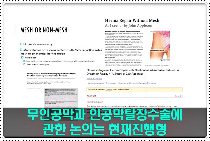 전통적인 탈장 수술은 병변 부위를 절개한 후 손상된 근막을 대체하는 인공근막을 바깥쪽으로 통과하는 방식으로 이루어졌습니다. 그러나 수술 후 지속적인 통증이 있고 절개부위 회복을 위한 치료지연 문제로 인해 입원부담이 가중되었습니다.