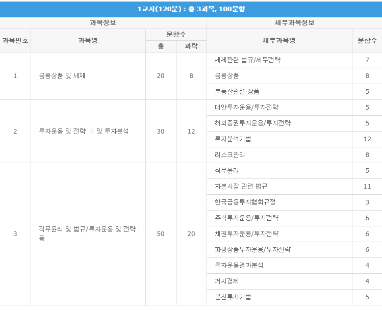 시험과목 3과목 총 100문제가 객관식 4가지 선택으로 출제되며 시험시간은 쉬는 시간 없이 10:0012:00 두 시간 동안 진행된다.