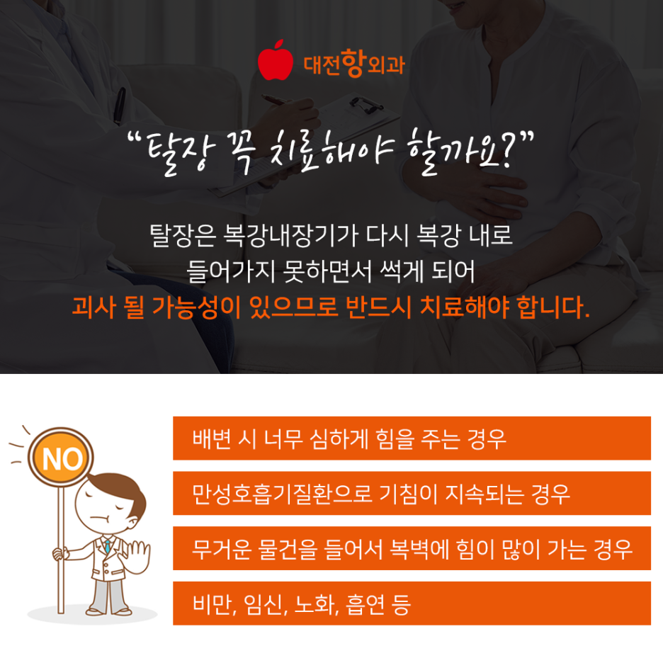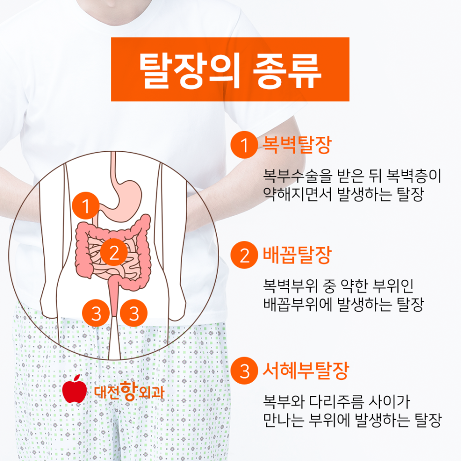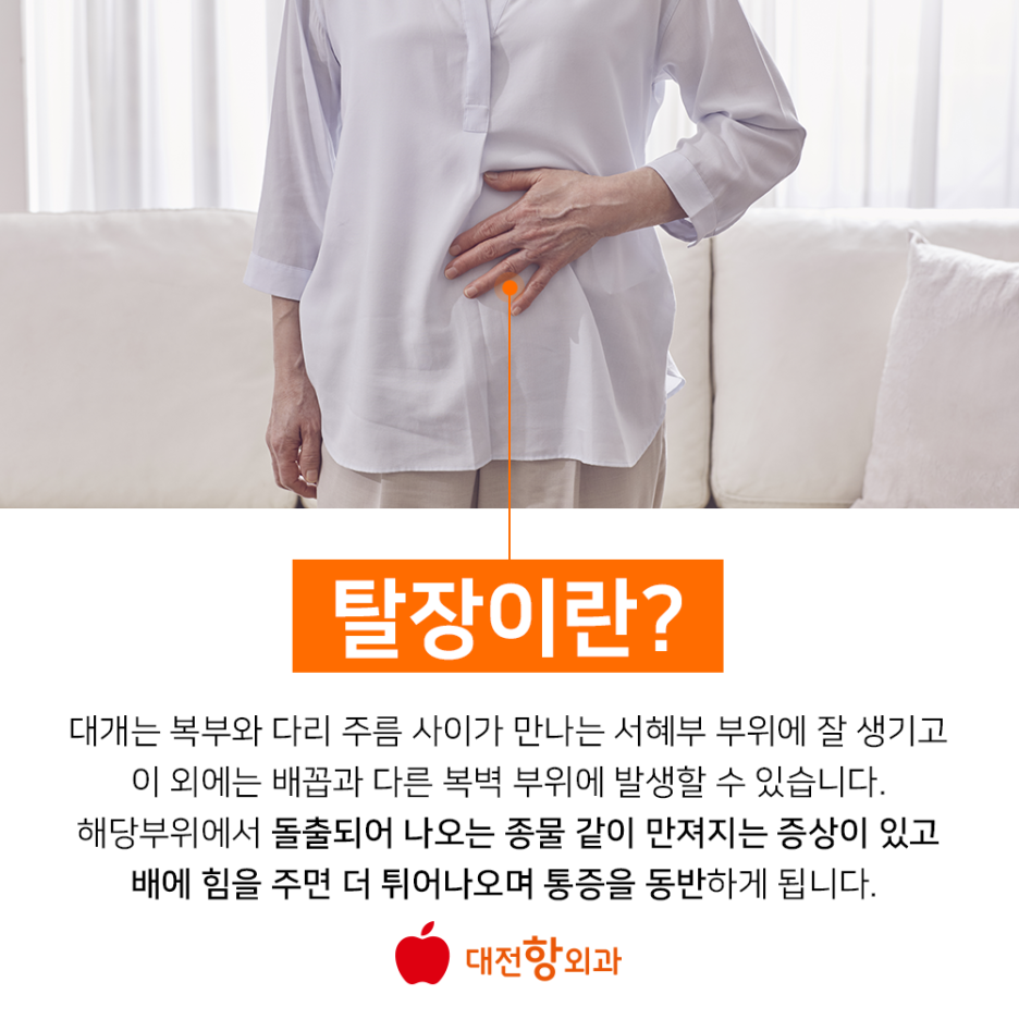 탈장이란 신체의 장기가 제자리를 벗어나 다른 조직을 통해 빠져나가거나 돌출되는 탈장, 즉 복부 내부 공간인 복강에 위치해야 할 장기가 복강 밖으로 나온 상태를 말합니다.대게는 다리 주름사이가 만나는 서혜부에 잘 생기고 그 외에는 배꼽과 다른 복벽에도 발생합니다.해당 부위에서 돌출되어 나오는 종물처럼 닿는 증상이 있으며, 배에 힘을 주면 더욱 튀어나오는 통증을 수반하게 됩니다.또 소아에게 많이 발생하는 대전 소아디스크는 태아 초기 고환이 태아의 뱃속에 위치하여 체강을 따라 서혜부로 내려와 음낭에 위치하는데, 고환이 내려오고 나서 고환이 내려온 길은 저절로 막힙니다.여아의 경우 고환이 내려오도록 서혜부에 내려가지만 복강 밖으로는 나가지 않고 대음순을 향하는 길만 형성되어 자연스럽게 막혀 버립니다.일부에서는 이 길은 자연스럽게 막히지 않고 열려 있지만 복강 내 장기가 이 길을 따라 내려오는 경우도 있습니다.이때 이 열린 길을 통해 창자가 내려오는 경우 소아서혜부탈장이라고 합니다.