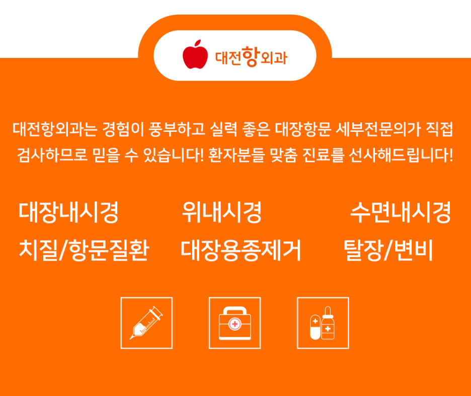 대전항외과는 경험 많고 실력 높은 대장항문의 세부 전문의가 직접 진료하여 믿을 수 있습니다.환자 개개인에 맞는 일대일 진료를 제공하고 있습니다.대전 소아 탈장 치료 뿐만 아니라 수면 내시경, 위 카메라, 대장 용종 제거 등 다양한 진료를 운영하고 있으므로 대장 항문과 관련된 불편을 느끼시면 저희 병원으로 오시기 바랍니다.