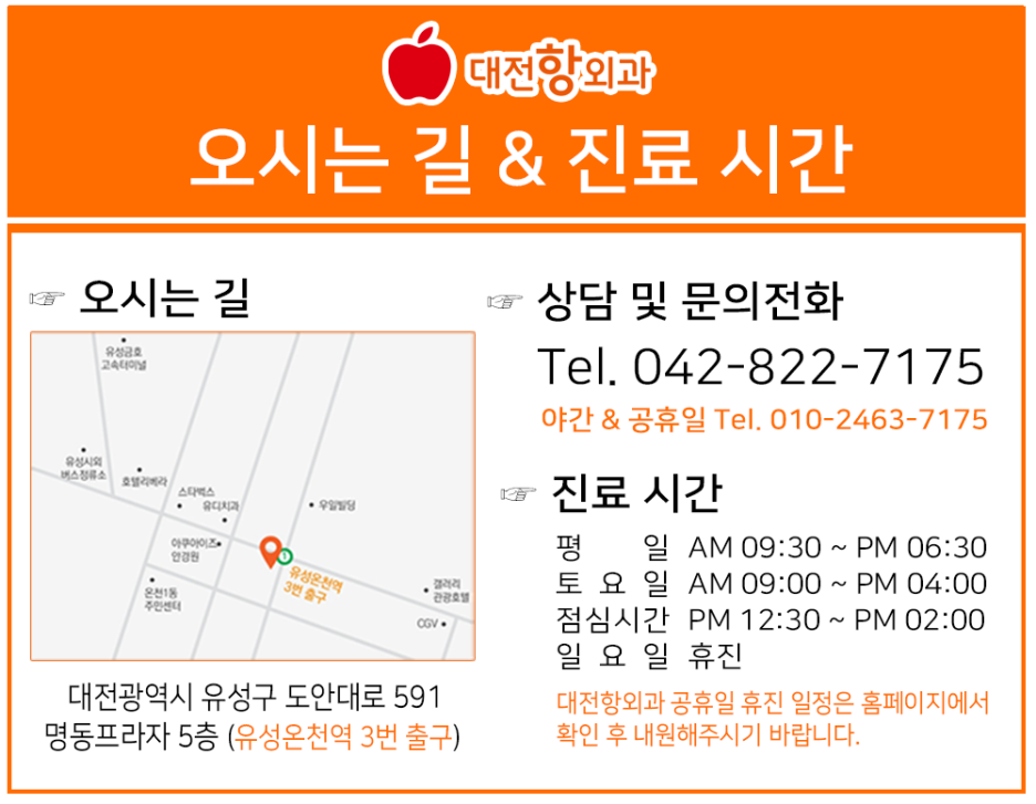대전소아탈장치료병원 대전항외과는 일요일 휴진이며 공휴일 휴진일정은 홈페이지에서 확인하시기 바랍니다.