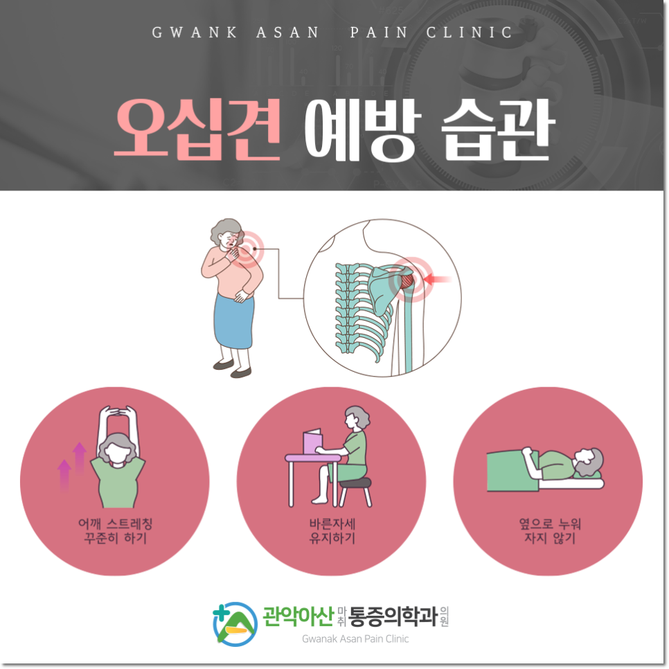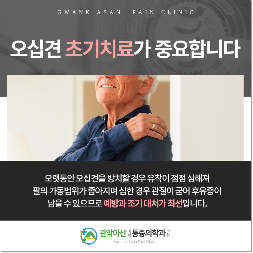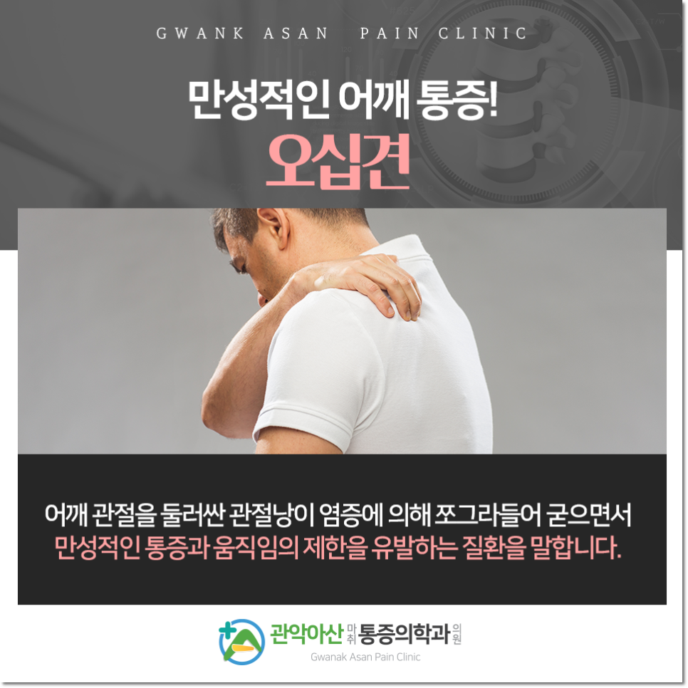 50대에 많이 발생한다고 해서 붙여진 ‘오십견’은 이유 없이 팔을 들어올리는 동작이 어려운 질환입니다. 예전에는 중장년층에 집중적으로 나타났는데 근래에는 40대 전후부터 폭넓은 연령층에서 경험되고 있어 특정한 대상으로 한정되지는 않는데요. 점진적인 퇴행으로 발생하는 증세인 만큼 조기진단과 적절한 치료를 통해 악화와 재발하지 않도록 신속히 대처하는 것이 중요합니다.