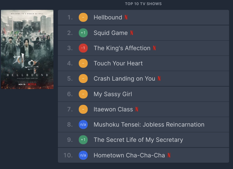 ‘1위 지옥(Hellbound)’ ‘2위 오징어 게임(Squid Game)’ ‘3위 연모(The King’s Affection)’ ‘4위 마음이 미치다(Touch Your Heart)’ ‘5위 사랑의 불시착'(Crash Landing on You) ‘4위 마음이 닿는다'(Touch Your She Heart) ‘6위 사랑의 불시착'(Irash Landing) ‘그녀) ‘6위’s Glass’s Name) ‘Iright Seakeart’Iright Seach Class’s Class’I