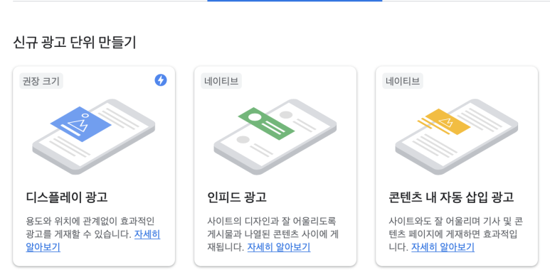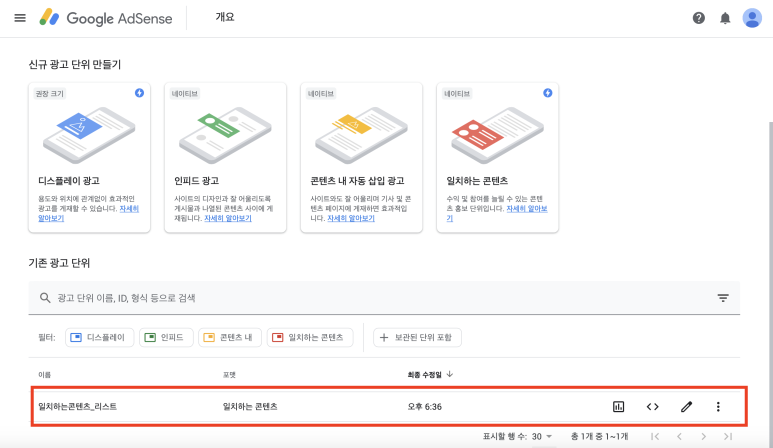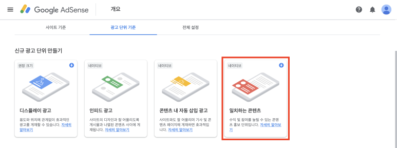 이 3종류의 광고형태는 바로 적용할 수 있는데!! 가장 원하는 [일치되는 콘텐츠]광고는 처음에는 목록 위에 아예 보이지 않았어.