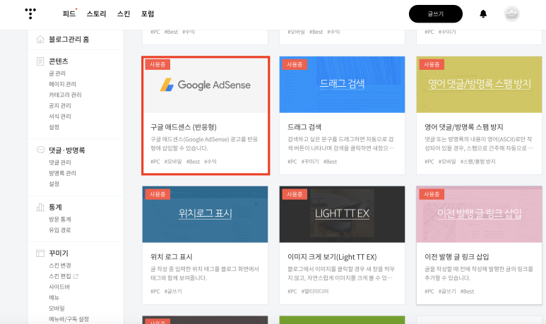 [일치하는 콘텐츠] 광고 코드를 복사한 상태에서 본인의 티스토리 관리자 모드 > 플러그인에 들어간다.