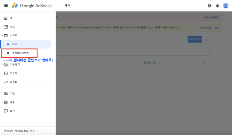이와 같이 구글 어드센스의 홈 페이지에 액세스 해 보면, 왼쪽의 리스트의[사이트]에 일치하는 컨텐츠가 억!! 떠 있는 것을 확인할 수 있다.