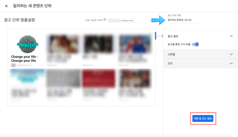 여기에 화살표를 넣은 곳에 광고 이름을 붙여야 하는데 이건 그냥 본인이 붙이고 싶은 대로 하면 된다.그리고 광고 옵션을 활성화하고, 그 아래에 있는 스타일, 사이즈는 기본 세팅으로 하면 된다.(만지는 것 없음)