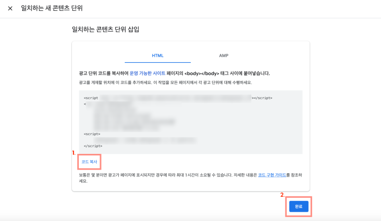 그럼 또 엄청 긴 코드 하나가 나와 ㅎㅎ 코드복사 눌러주고 완료를 누르고 나와