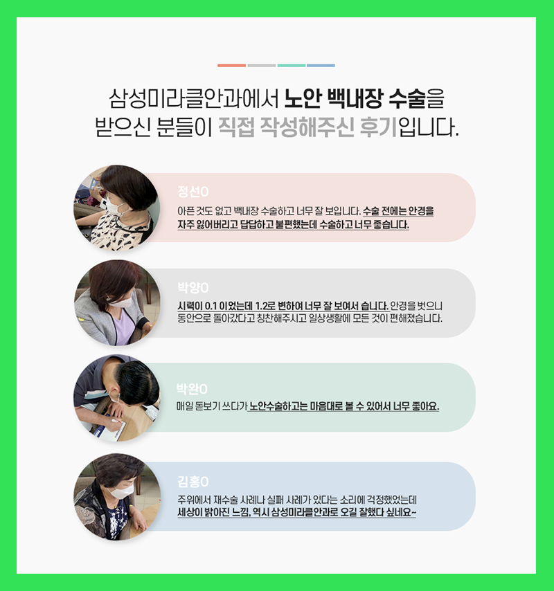 백내장은 많은 합병증을 초래할 위험성이 있고, 증상이 심한 경우 실명의 가능성도 있는 질환이므로 경각심을 가질 필요가 있는 질환이었습니다.