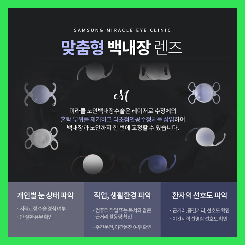 근거리-중거리-원거리까지 초점이 자유로워지는 렌즈, 독서 등 근거리 작업을 할 때 편리한 렌즈, 야간 운전 시 도움이 되는 렌즈 등 개인의 직업과 생활 패턴에 따라 다양한 렌즈가 개발되고 있는데. 그래서 의사와 환자가 그에 대한 상담을 충분히 한 후 렌즈를 선택하여 수술을 결정하는 편이 좋았지요.