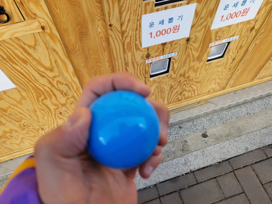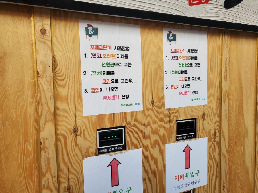 동성로의 명소에서 점괘를 뽑으려면 천원짜리 지폐가 필요하다 뽑기 기계에는 전용 동전이 있어야 하는데 그건 천원밖에 안 들기 때문이다.다행히 지폐교환기가 동전을 사는 곳과 함께 있어서 바로 지폐를 바꿔서 동전을 획득할 수 있는 동성로 놀이였다.사실 나도 1만원짜리밖에 없었는데 얘가 빨리 바꿔줘서 즐겁게 내 운세를 확인할 수 있었다.