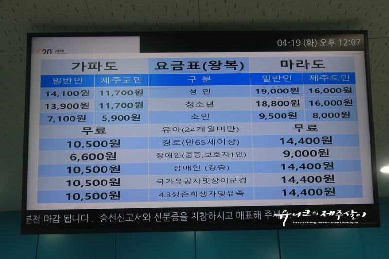 요금은 이렇고, 특히 제주도민은 주소지가 표기된 신분증이 있어야 할인을 받을 수 있습니다.저희는 오전 9시 30분 배였고 당일 예약이 아니여서 대기자 명단 없이 순조롭게 진행됐거든요.도착하면 가장 먼저 탑승자 전원의 승선신고서를 작성하고 창구에서 신분증을 보여주고 예약해 주시면 오가는 승선권을 발권해 줍니다.