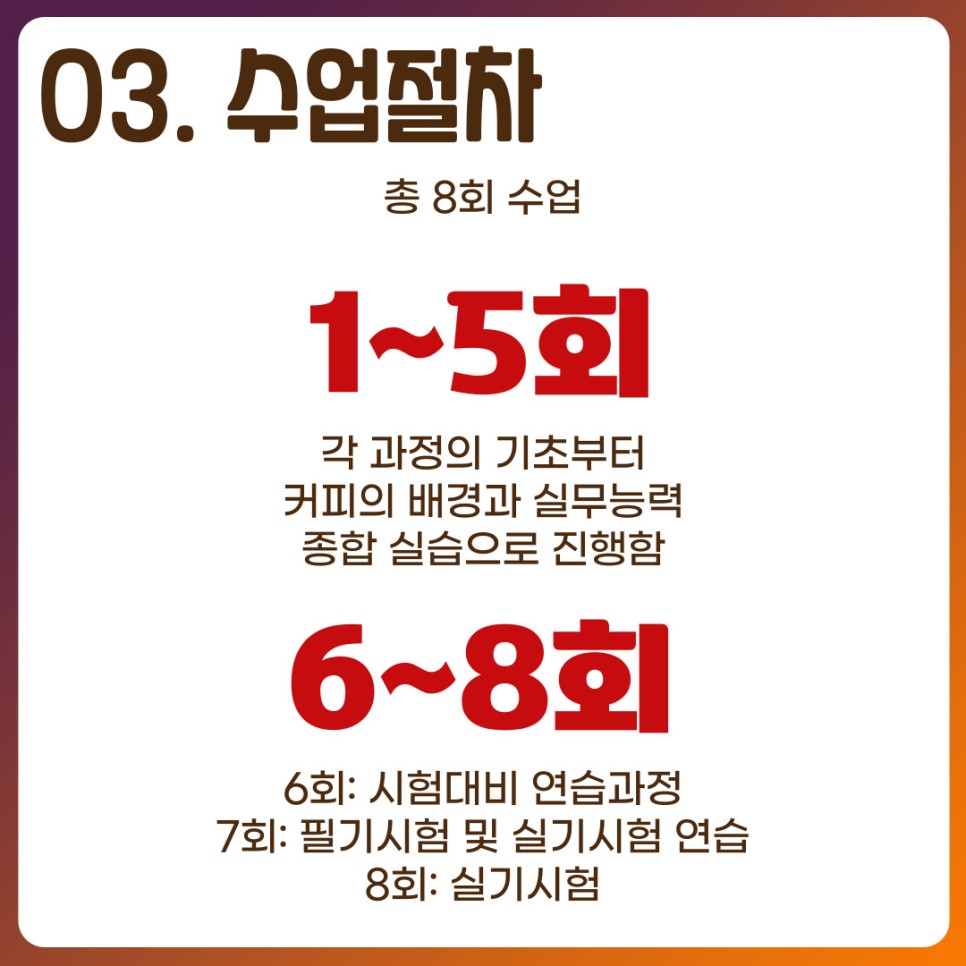 7~8번째가 필기, 실기이기 때문에 이때! 되도록 많은 것을 정리하고 커피 실습을 하는 것이 좋을 것 같습니다.