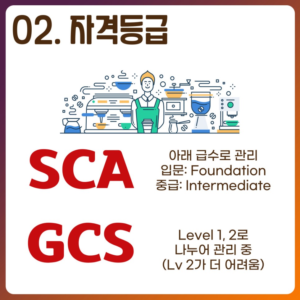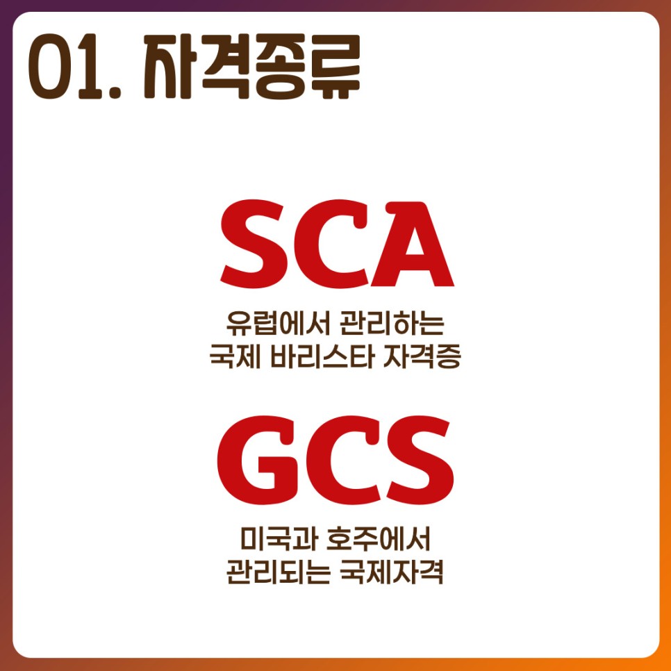 현재 바리스타 학원 자격증 종류는 SCA와 GCS로 나눌 수 있습니다이중 SCA는 유럽에서 관리하는 커피전문 라이선스로 GCS는 이보다 큰 커피시장인 북미지역과 호주가 연합하여 만든 국제자격증입니다.두 교육 모두 자격등급별로 8차, 총 16차시 수업으로 이루어집니다.