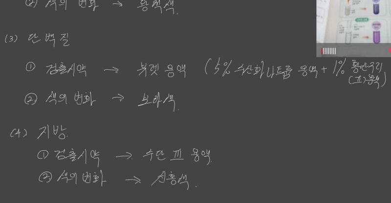 3. 영양소 검출 반응 실험이 가장 중요한 파트이지만 그렇다고 원리를 이해하지는 않습니다.그냥 암기를 해야 하는 제가 싫어하는 중2과학 부분입니다.솔직히 제가 워낙 암기를 싫어해서요.일단 하나씩 살펴보도록 하겠습니다.(1)전분 : 아이오딘-아이오딘화 칼륨 용액 – 청람색으로 변화 (2) 포도당 : 베네딕트 용액 – 황적색으로 변화 (3) 단백질 : 5% 수산화나트륨 수용액 + 1% 황산구리 (Ⅱ) 수용액 – 보라색으로 변화 (4) 지방 : 수단 (Ⅲ) 용액 – 선홍색으로 변화