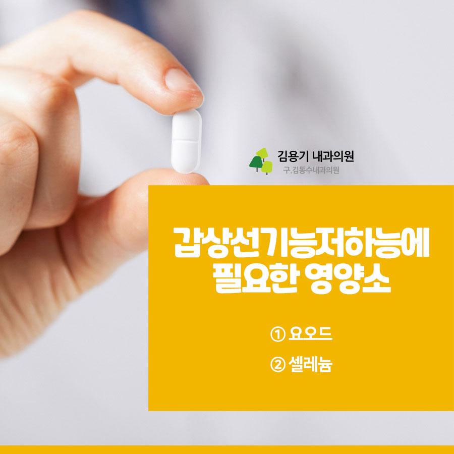 갑상선기능저하증에 필요한 영양소1)요오드요오드의 섭취가 부족하거나 많다고 해서 무조건 갑상선기능저하증 또는 갑상선기능항진증을 유발하는 것은 아닙니다. 갑상선 기능 저하증은 갑상선 호르몬이 잘 분비되지 않아 나타나는 증상으로 요오드가 결핍되면 생길 수 있는데, 한국인의 경우 요오드 부족으로 인한 갑상선 기능 저하증이 드물며, 주로 갑상선염에 의해 발생한다고 합니다.