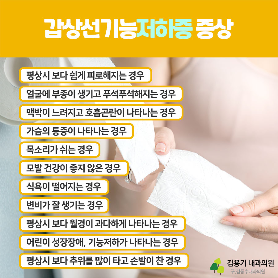 갑상선 기능 저하증 증상 – 평소에 보다 쉽게 피로해지는 경우 – 얼굴에 부종이 생기고 푸석푸석해지는 경우 – 맥이 느려지고 호흡곤란이 오는 경우 – 가슴통증이 나타나는 경우 – 목소리가 쉬는 경우 – 모발건강이 안 좋은 경우 – 손발이 냉한 경우 – 변비가 잘 생기는 경우 – 평소보다 월경이 잘 나타나는 경우 – 성장이 지나서인지육이 더 잘 되는 경우 – 평소보다 월경이 많이 나타나는 경우