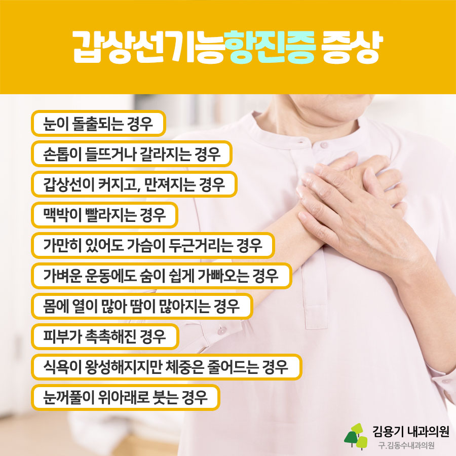 갑상선 기능 항진증 증상-눈이 돌출되는 경우-손톱이 뜨거나 갈라지는 경우-갑상선이 커져서 닿은 경우-맥박이 빨라지는 경우-가만히 있어도 가슴이 두근거리는 경우-가벼운 운동이라도 숨이 금방 가빠지는 경우-몸에 열이 많고 땀이 많아지는 경우-피부가 윤택해지는 경우-식욕이 있는 경우-식욕이 곧 심해지는 경우