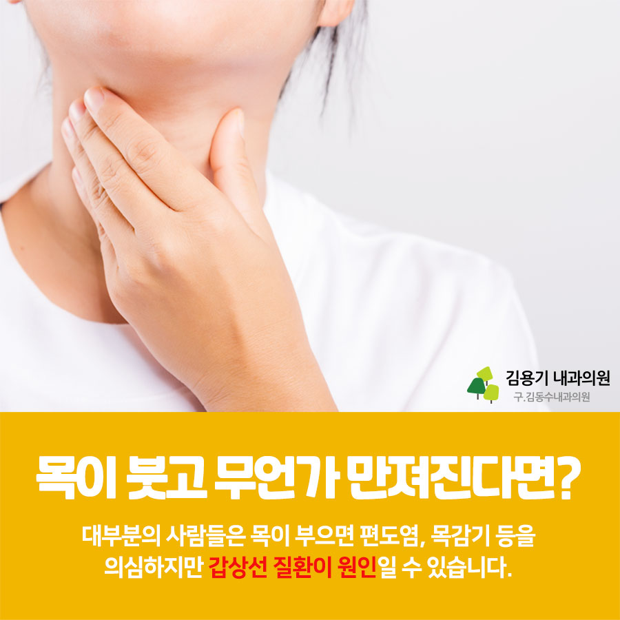 목이 부은 느낌과 목에 무언가가 닿거나 체온조절이 잘 되지 않아 체중이 급격히 변하는 등 다른 증상이 동반되면 갑상선 이상을 의심해 보세요.의료기관에 내원해 보세요.