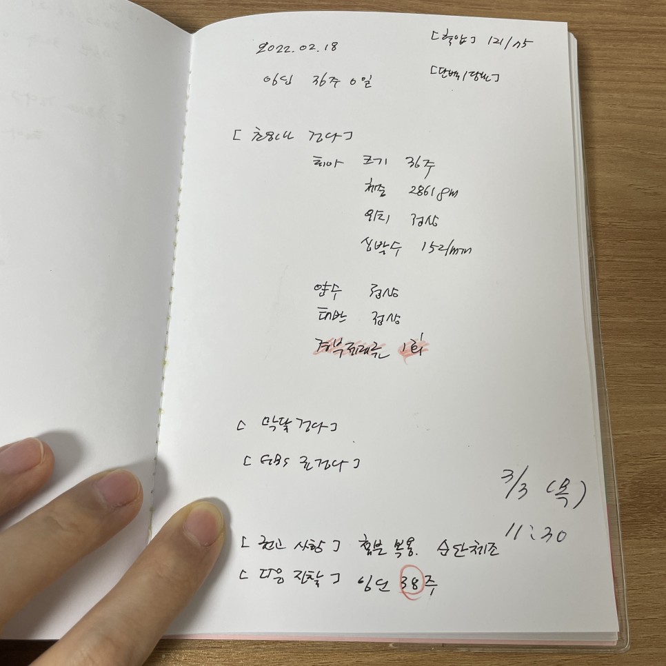 심상덕 원장님께서 늘 손으로 작성해주시는 정성 가득한 산모수첩 ? 다음 진료는 38주지만 37주 6일 예약을 잡아오기