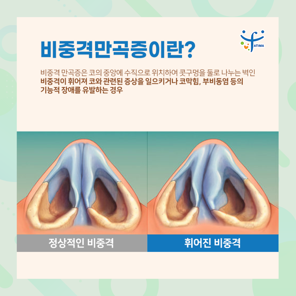 이러한 중요한 역할을 하는 비중격이 휘거나 뒤틀려서 역할을 하지 못하고, 코의 기능적인 장애를 유발하는 경우를 비중격만곡증이라고 합니다.
