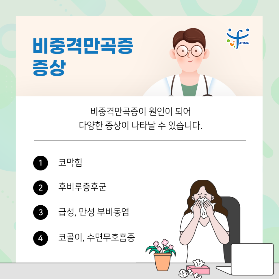 이외에도 후비루, 비염, 비부동염 등의 코 질환도 생각할 수 있습니다. 코골이나 수면 무호흡증 등 수면 장애나 두통, 안면통 등의 통증이 생길 수도 있습니다.