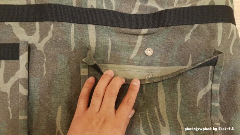 서코백 앞에는 두 개의 포켓이 있습니다.스트랩이나 픽스 그립 같은 것을 넣을 수 있어서 좋습니다.두 개의 포켓도 자석 스냅으로 되어 있어 편하게 개폐할 수 있습니다.50% 로스 제품이라 앞 스냅버튼이 조금 불량하다고 했는데 별로 사용하는데 불편한 점은 없었어요.