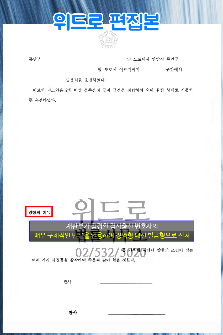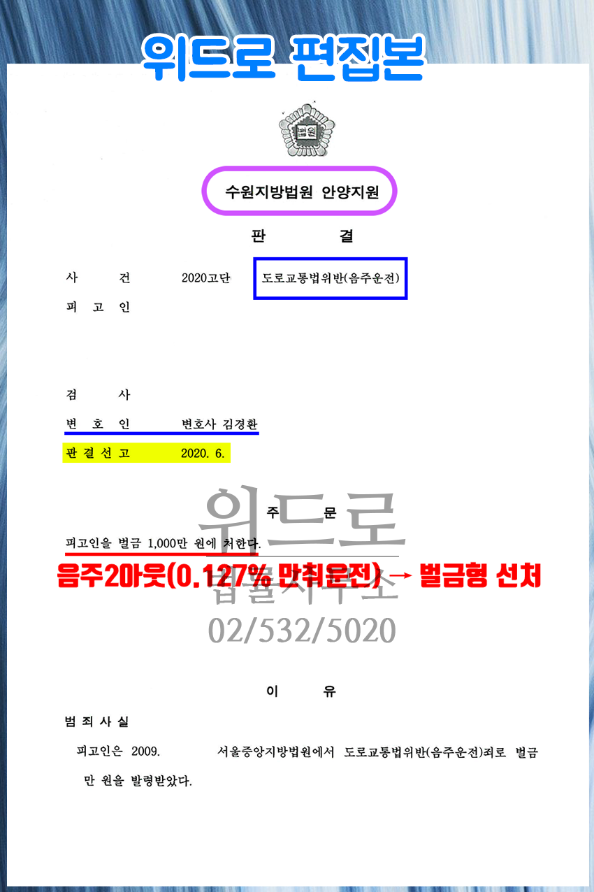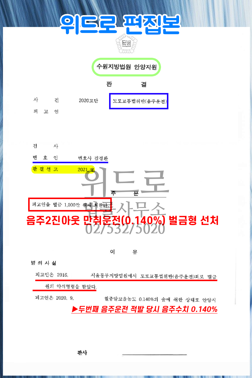 수원지법 안양지원 음주 2회 만취운전 벌금형 선고