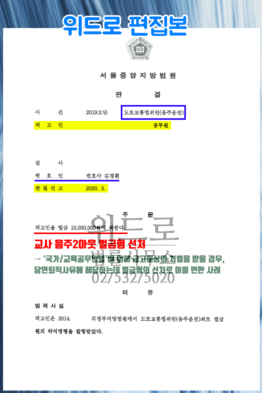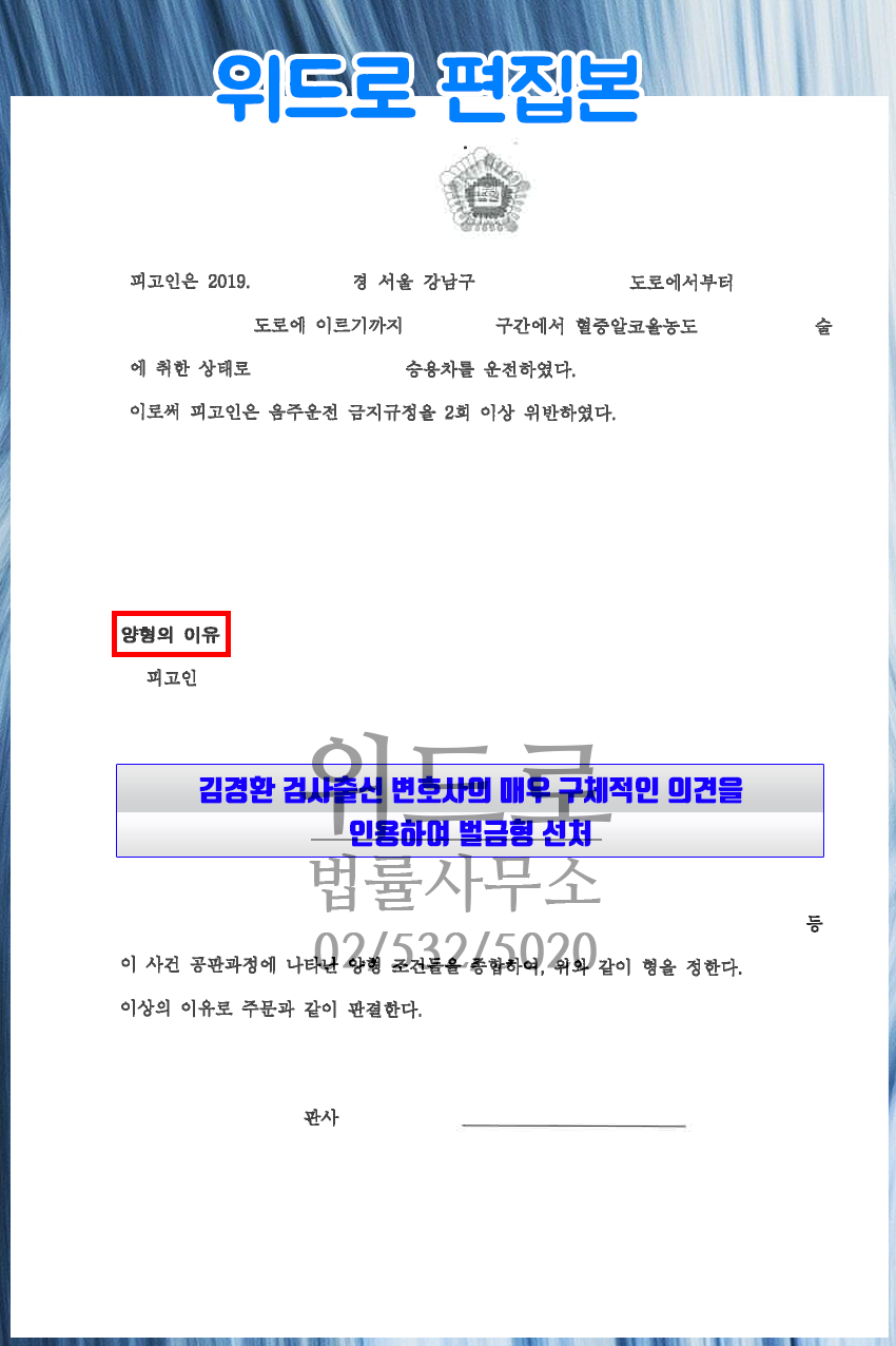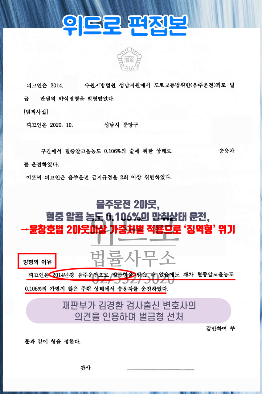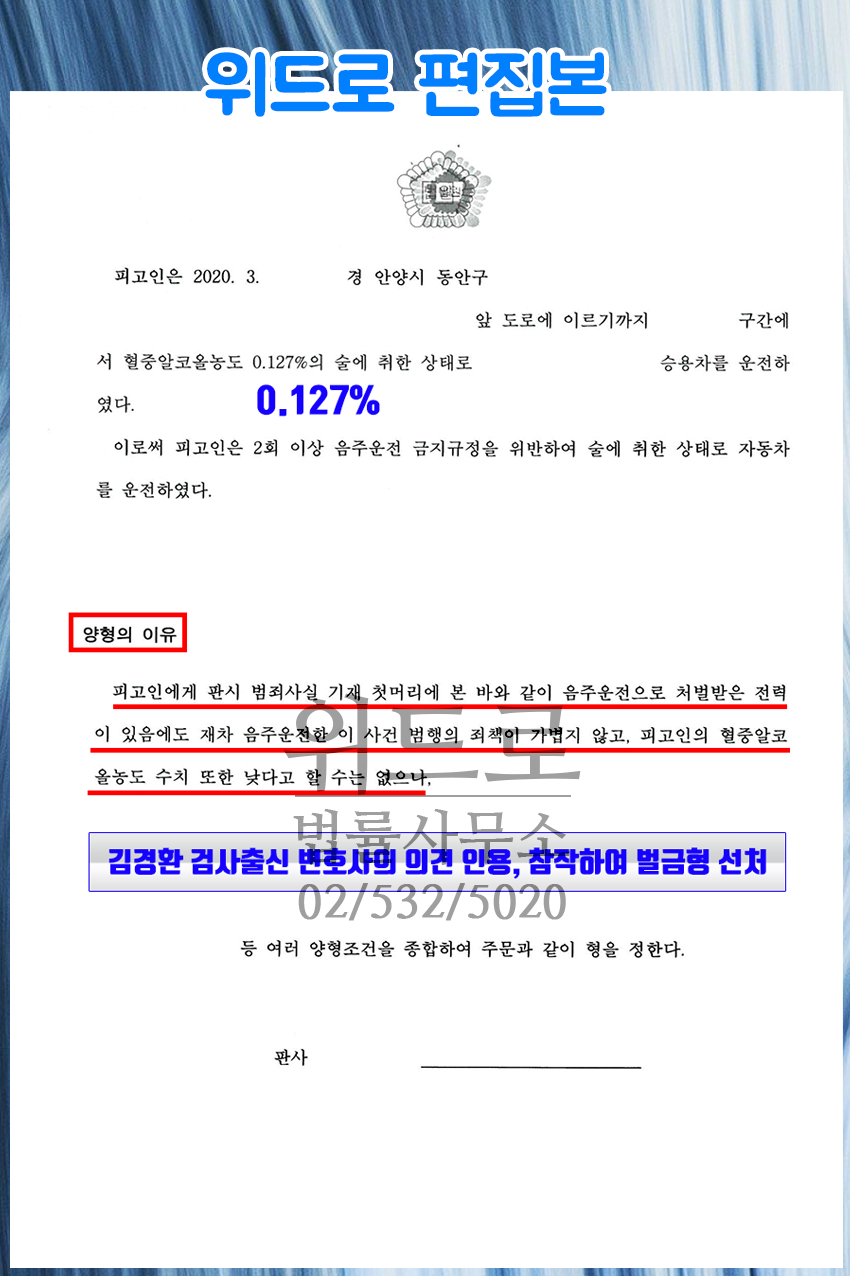 0.127%라는 높은 수치로 두 차례에 달했지만 법원은 법률대리인의 의견을 받아들여 벌금형을 선고했고 J씨는 회사의 해고 위기에서 벗어났습니다.