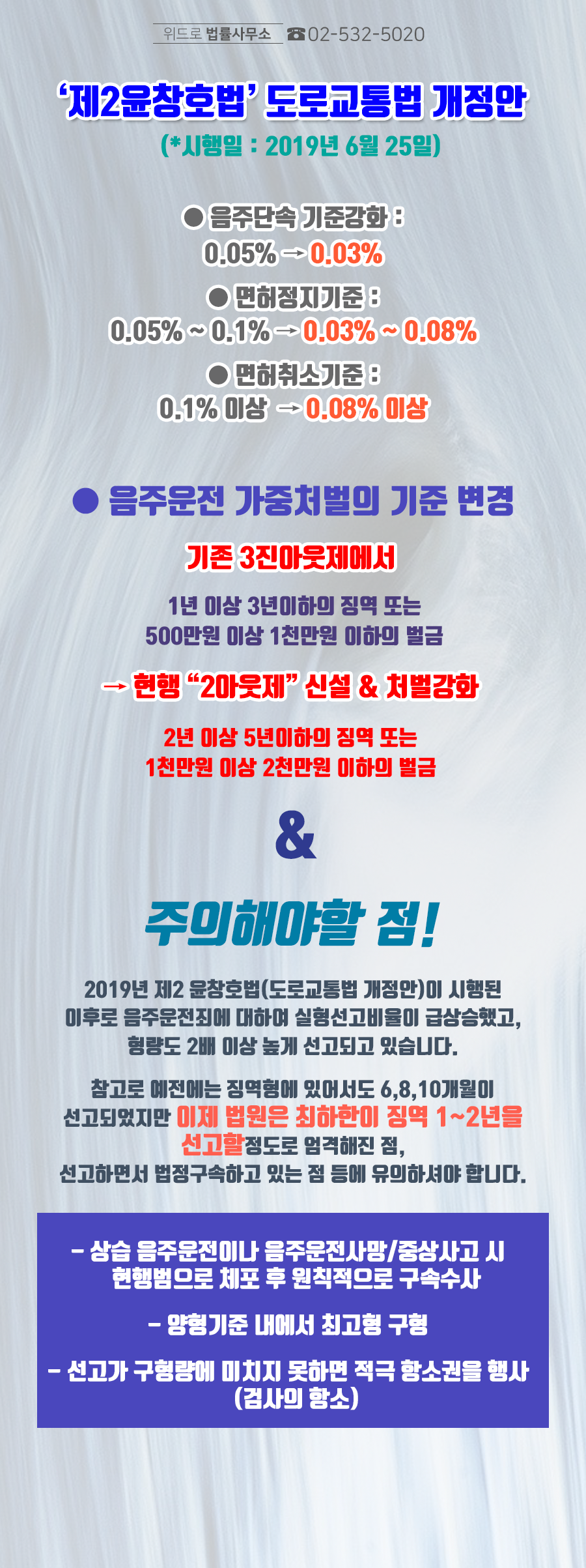 이전에는 음주 5회에 해당된다고, 가중처벌을 했다면 현재는 2회만 적발돼도 2년 이상 5년 이하의 징역 또는 1천만원 이상 2천만원 이하의 벌금에 처해질 수 있습니다. 혈중 알코올 농도 수치 역시 기존 0.05%에서 0.03%가 돼도 단속되기 때문에 소주 한 잔을 마시고 운전하는 것도 윤창호법의 기준이 될 수 있습니다.