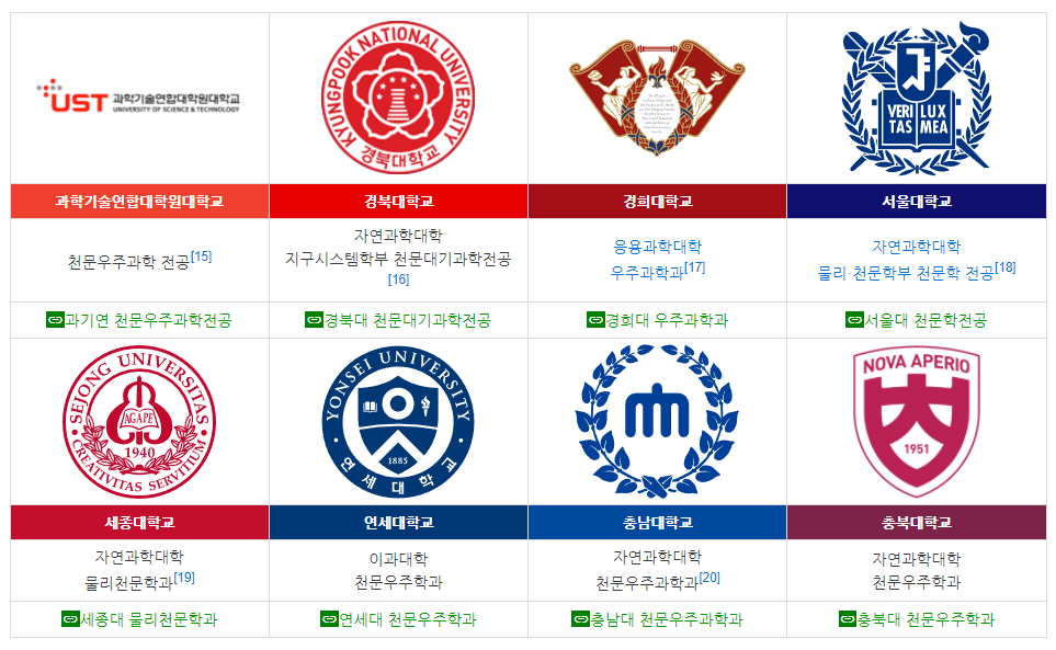 ○ 서울특별시 서울대 – 물리·천문학부 천문학 전공 세종대학교 – 물리천문학과 연세대학교(신촌캠퍼스) – 천문우주학과