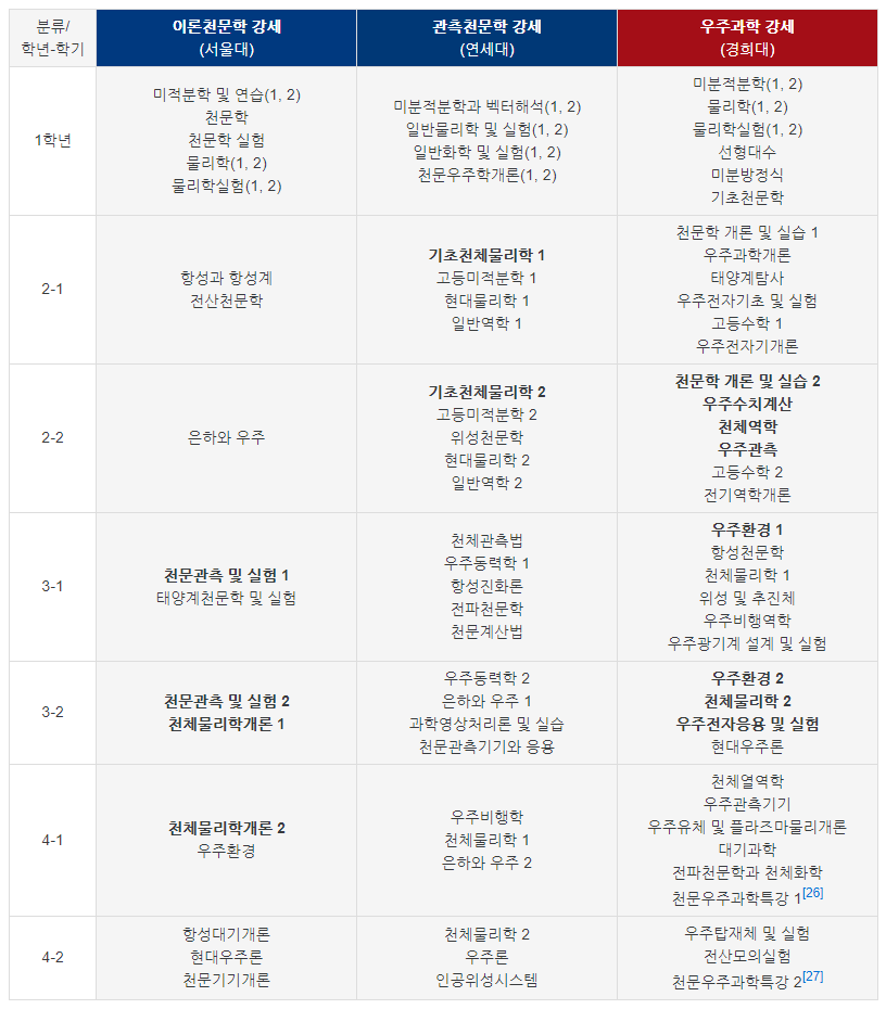 위와 같이 이론/관측/우주과학 중 어디가 특화되어 있느냐에 따라 학부 커리큘럼이 영향을 받기도 합니다.”위 표에서 서울대 천문 관측, 연세대 천체 관측, 경희대의 우주 관측은 모두 같은 과정을 의미하지만 미묘한 명칭의 차이는 있습니다”각 전공에서 제공하는 강의 수나 전공필수가 지정된 것 또한 특성에 따라서 차이를 알 수 있습니다.