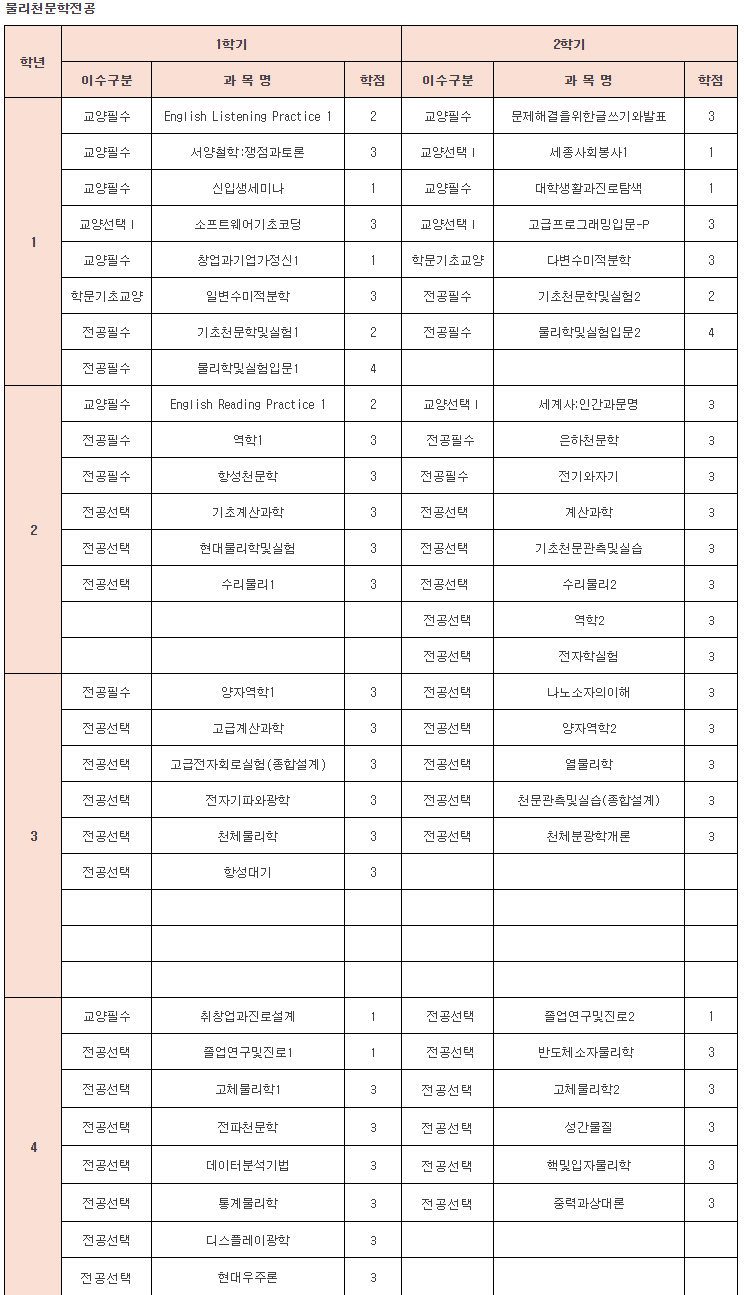 물리·천문학부 천문학 전공(영문명 : Dept. of Physics & Astronomy, Astronomy Program) 서울대는 단일학부가 아닌 세부 전공으로 규모가 크지 않은 점을 고려하여 필수 천문학 강의에 집중하게 되며, 강좌 수가 다른 과에 비해 적은 편입니다.서울대의 경우 천문학 개론 대신 천체관측을 2학기에 걸쳐 전공필수로 지정했죠.