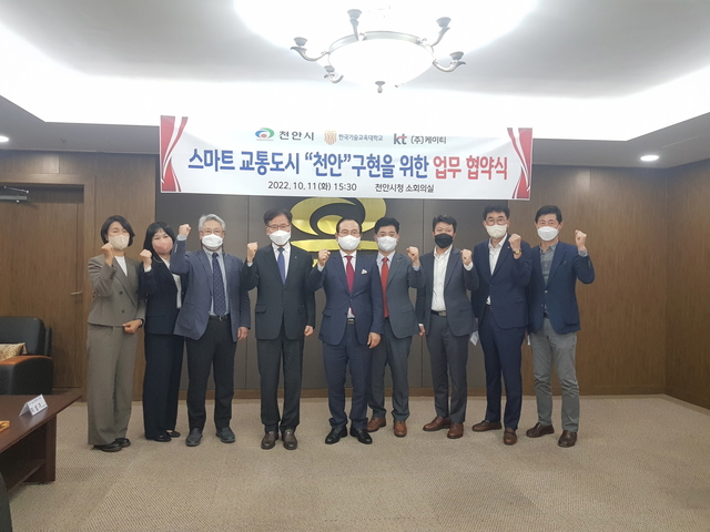 안녕하세요 천안시입니다. 천안시가 10월 11일 시청 소회의실에서 한국기술교육대학교, 주식회사 KT와 스마트 교통도시 구현을 위한 업무협약을 체결하였습니다. 이번 협약은 우수한 인적자원을 갖춘 한기대, 디지털 혁신 세상을 이끌고 있는 KT, 그리고 지능형교통체계(ITS) 사업에 240억원을 투입하는 천안시 등 민·관·학이 협력해 똑똑하고 편리한 교통안전 서비스를 만들어 나간다는 데 큰 의미가 있습니다.협약 내용 함께 보시죠.