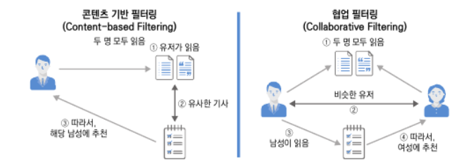 하지만콘텐츠기반의필터링도한계점을가지고있습니다. 콘텐츠의 정보를 모두 포함하기가 어렵다는 점입니다. 예를 들어 케이팝 그룹 엑소 멤버 중 수호의 팬들은 멤버 수호만이 등장하는 추천 콘텐츠를 찾고 있지만 겹치는 콘텐츠 정보가 많아 원치 않는 그룹 전체 혹은 그룹 내 다른 멤버들의 활동 모습이 담긴 콘텐츠를 추천받기도 합니다. 이와 같이 알고리즘의 입장에서 이용자의 성향을 상세하게 파악하기 어렵다는 문제가 발생합니다.협업 필터링(collaborative filtering) 협업 필터링은 많은 사용자로부터 얻은 기호 정보를 통해 사용자의 관심사를 자동으로 예측할 수 있게 하는 방법입니다. 같은 행동을 한 사람을 하나의 프로파일링 그룹으로 묶어서 그룹 내 사람들이 공통으로 본 콘텐츠를 추천하는 방법입니다. 예를들면,쇼핑몰에서상품을구매하면그상품을구매한사람이구매한다른상품을추천상품으로보여주거나SNS에서친구가된사람의친구를자동추천하는개념입니다.