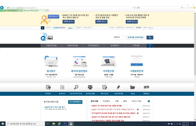 산업인력공단 홈페이지가 아닌 q-net에 접속해야 한다.원서접수 국가기술전문자격 원서접수신청 합격자/답안발표 개인득점조회 및 합격자/답안발표자격신청 상장형·수첩형 자격증 발급시험 일정안내 국가기술·전문시험 일정 자격정보 응시자격자진단 원서접수상황확인서신청 응시자준비물자료실환불정보 원서접수중인 시험공지자격제도시행 출제서비스개선고객님 오더 큐넷 서비스 먼저 www.q-net.or.kr