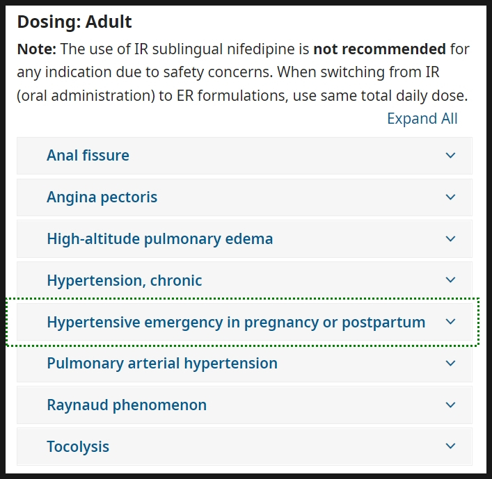 Nifedipine extended release¶Calcium channel blocker30 to 60 mg once daily as an extended release tablet, increase at 7 to 14 day intervals30 to 90 mg once daily120 mgDo not administer sublingually.In some patients the dose may be divided into 2 doses daily to avoid large drops in blood pressure and to minimize adverse effects (eg, instead of increasing the dose to 60 mg daily, it may be desirable in some patients to increase to 30 mg 2 times daily).MethyldopaCentrally acting alpha agonist250 mg 2 to 3 times daily, increase every 2 days as neededΔ250 to 1000 mg in 2 to 3 divided doses3000 mgSedation is a common side effect.* Chronic hydralazine doses above 100 mg daily are associated with an increased risk for developing lupus erythematosus, particularly in women and slow acetylators; ascertainment of acetylator status is recommended before increasing dose above 100 mg per day in many countries.¶ UpToDate suggests not using immediate-release nifedipine (oral or sublingual) because it can cause significant rapid decreases in blood pressure. If used, the dose is 10 to 20 mg every 2 to 6 hours, with a maximum daily dose of 180 mg.Δ The full hypotensive effect of an initial dose or adjustment of methyldopa may not occur until after 2 to 3 days of continuous use . REF . UpToDate 2021 . 12 . 18