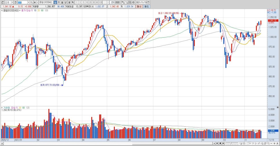 ▲코스닥지수=코스피지수보다 다소 탄탄한 수준을 보이고 있는 코스닥시장 1,050선을 향해 꾸준히 반등하고 있다.