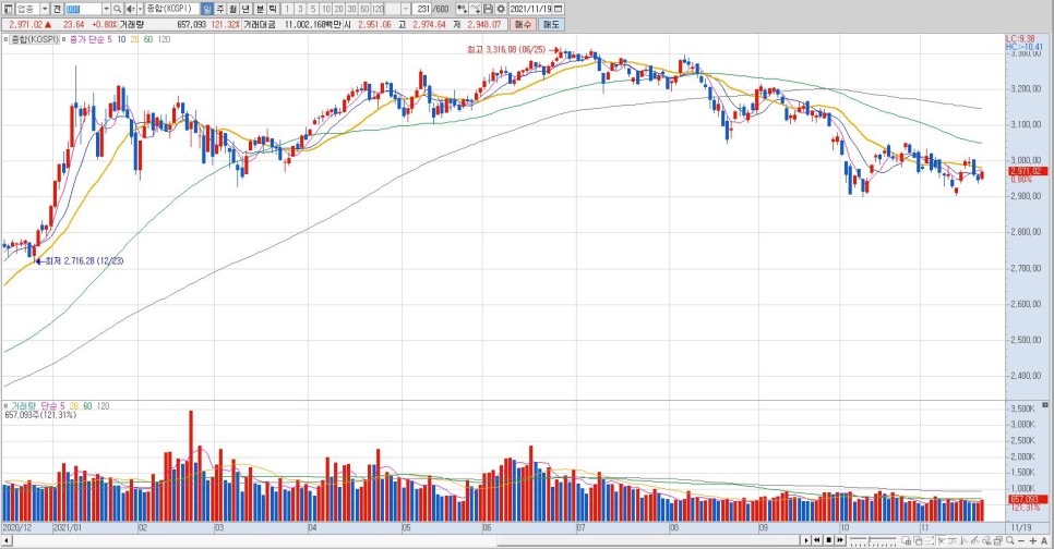 2021년 11월 19일 금요일 국내 증시지수 코스피 2,971.02(▲23.64 / 0.80%) 코스닥 1,041.92(▲9.15 / 0.89%) 국내 코스피, 코스닥지수 동향■외국인/기관이 동반 매수 코스피지수 0.80% 상승하며 2970선까지 회복. 대형주를 중심으로 주가가 오르면서 지수 상승을 이끌면서 4거래일 만에 코스피지수가 반등했다.■코스닥지수 역시 외국인/기관투자가의 매수 공세로 0.89% 올라 1,040선 안착.■원-달러 환율 직전 거래일보다 4.90원 오른 1달러=1,185.30원으로 마감한 국내 주요 경제소식■19일 금융정보업체 에프앤가이드에 따르면 지난달 13일 동시 상장한 국내 메타버스 ETF 4종에 지금까지 4758억원이 유입된 것으로 나타나 올해 들어 국내 상장 테마형 ETF 가운데 가장 두드러진 자금이 유입됐다. 개별 펀드로는 미래에셋자산운용의 #(TIGER Fn메타버스) ETF에 가장 많은 자금이 되는 2167억원이 유입됐다. 실제로 코스피지수가 하락세를 보이고 있음에도 메타버스 ETF는 높은 수익률을 기록하고 있고 실제로 메타버스 ETF 4종 모두 최근 한 달 수익률 상위 20위 안에 모두 이름을 올렸다. 코덱스 K-메타버스액티브 ETF는 한 달 수익률이 37.10%에 이르며 한국 ETF 수익률 4위를 기록한 ■LG전자, 2025년경 애플의 완전 자율주행 전기차 출시 소식에 19일 코스피시장에서 8.98%(133,500원) 오른 133,500원으로 장을 마치며 강세를 보였다. LG전자는 캐나다의 자동차 부품업체 마그나인터내셔널과 설립한 합작법인 엘지 마그나 이파워트레인을 통해 애플카 생산에 협력할 수 있는 가능성이 지속적으로 제시되고 있어 수혜를 보고 있는 것으로 보인다. LG전자는 장중 한때 상승폭이 12.24%까지 컸으며 LG그룹 관련 LG전자 우(5.75%), LG우(2.01%), LG우(1.11%), LG이노텍(1.05%) 등도 오름세를 보였다. 또 애플카 수혜주로 꼽히는 덕우전자(3.99%), 신성델타텍(3.48%), 현우산업(2.85%) 등도 상승해 인포뱅크와 라닉스는 각각 상한가를 달성했다.■삼성바이오로직스, 7월 미국 일라이릴리 계약 바이오 의약품 위탁생산량을 당초 1억5000만달러에서 1억1800만달러 증가한 1억1800만달러 규모로 변경했다고 발표. 위탁물량을 거의 2배 가까이 늘려 양사의 신뢰관계를 과시함 또 다른 글로벌 제약사인 로슈, 길리어드, 아스트라제네카, TG테라퓨틱스 등 올 들어 공시된 증액 계약건수만 총 8건에 이르며 금액 규모로는 8631억원에 달하는 등 위탁생산 계약물량을 지속적으로 확대했다. 한편 관련 소식에 삼성바이오로직스 주가는 19일 종가 기준으로 6.06%(89만2000원) 오른 89만2000원으로 마감해 강세를 보였다.■19일 한국거래소에 따르면 이달 1일부터 18일까지 14거래일 동안 개인투자자가 삼성전자 주식을 3607억원어치 순매도했다. 개인투자자들은 지난해 12월 2조2658억원을 순매수한 이후 지난달까지 순매수를 이어가고 있어 올해 들어 개인이 순매수한 삼성전자 주식만 35조309억원에 이른다. 그러나 반도체 업황 둔화에 대한 우려로 8월부터 순매수가 크게 줄면서 삼성전자 주가는 지난달 12일 10개월 만에 6만전자 수준으로 떨어졌다. 이에 따라 6만~7만원대를 넘나드는 답답한 흐름이 이어지자 개미들은 눈물의 ‘손절매’를 이어갈 것으로 보인다. 금융투자업계에서는 삼성전자의 하락세가 내년에 멈출 것이라는 분석도 나온다.■8000만원을 넘어 1억원대로 갔던 비트코인 환율이 다시 6000만원대까지 하락, 19일 코인거래소 업빗에 따르면 이날 비트코인 가격이 6915만원까지 떨어져 7000만원대를 내준 것은 지난달 14일 이후 한 달여 만이다. 사상 최고치를 기록했던 이달 8일 이후 불과 열흘 만에 15.1%나 급락했고 이더리움 역시 이날 장중 500만원 선이 붕괴되기도 했다. 코인 가격 급락은 최근 높은 물가상승률로 미국 연방준비제도가 예상보다 빠르게 금리를 인상할 것이라는 전망으로 미국 달러화가 강세를 보이면서 가상화폐의 약세를 보이고 있다는 분석이다. 시장에서는 기관투자가의 암호화폐 투자가 이제 막 시작됐다며 지금이 가장 싸다는 주장과 일본의 파산한 동전거래소 마운트곡스발 악재가 시작됐다는 관측이 맞서고 있다.■블록체인 게임을 통해 국내 블록체인 시장을 선도하고 있는 위메이드, 카카오의 블록체인 네트워크 클레이턴 기반의 디파이 서비스 「클레버(KLEVA)」를 연내에 공개한다고 19일 밝혔다. Difi는 블록체인과 스마트 컨트랙트를 이용해 금융서비스를 제공하는 것으로 Difi 참가자들은 가상자산을 맡겨 유동성을 공급하는 대가로 보상을 받게 되는 이자농업 Difi 서비스를 제공받게 된다. 이용자들은 담보물을 토대로 가상자산을 대여해 주고 더 많은 자산으로 이자농업에 참여할 수 있지만 고수익 기대 못지않게 위험도 크기 때문에 신중한 투자가 필요하다.국제 주요 경제뉴스■미국 블룸버그통신은 19일(현지시간) 2025년 애플이 자율주행한다고 보도했다. 애플에 정통한 소식통들의 말을 인용해 애플이 최근 애플카의 개발 목표를 운전자 보조 수준의 반자율주행 구현에서 운전자 없이 상업운행이 가능한 완전 자율주행 전기차 확보로 전환했다고 전했다. 기존 애플카의 개념은 보편적인 승용차 기반의 자율주행 기능 방식이었지만 바뀐 새 애플카의 개념은 운전석과 운전대, 가속페