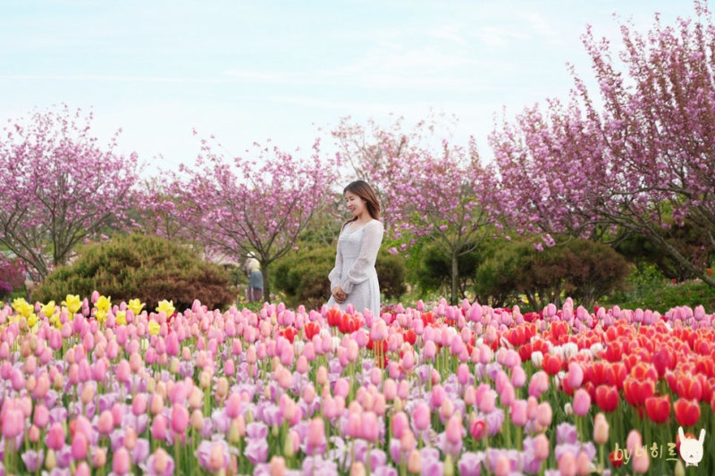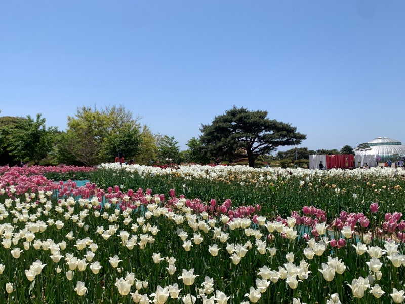 행사용 튤립 외에 원래 심어져 있던 벚나무가 저는 더 예쁘다고 생각했는데요. 공원 밖의 나무들은 꽃잎이 다 떨어졌지만 다행히 이곳 벚꽃은 예쁜 꽃이 남아 있었습니다.수국관 앞 벚나무 아래 벤치가 정말 예뻤는데 사진을 찍으려고 삼각대를 펼치니 어디선가 군중이 몰려 몇 장을 거두지 못했습니다.여기는 혼자 사진 찍기에는 조금 힘든 곳이었어요. 꽃 팀플레이를 해주세요.