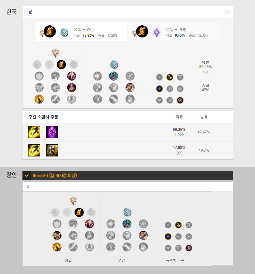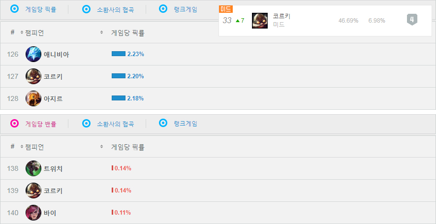 지금 급부상하고 있고 7순위도 올라가면서 계속 눈에 띄는 챔프입니다 아직 4티어이고 아직까지는 별로 관심이 없는 상태고요. 픽률이나 벤치만 봐도 거의 바닥났어요. 그래서 현재 <꿀>을 들이마실 수 있는 시기입니다. 미드라이너라면 꼭 한번 해보세요.