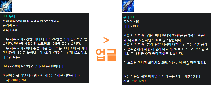 갑자기 결승에서 자주 등장한 무라마나는 해외의 템토리에서 시작되었습니다. 후반에 AD뻥튀기 계수, 추가딜과 매너보충으로 아주 좋은 인식을 줬거든요.” 콜키가 마나량 마나 소비감소 버프를 먹어도 기본적으로 스킬 마나가 많이 걸려요. 그래서 항상 한 타도 지속되고 싸우다 보면 너무 부족한 마나로 인한 델로스의 발생이 잦았습니다. 그래서 등장한 것이 첫 번째 아이템으로 부족한 매너를 보완하는 것이었습니다.