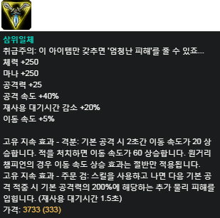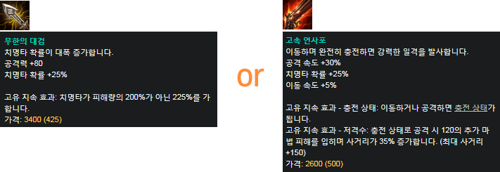 본격적으로 치명적인 아이템을 맞출게요 콜키는 평타에 AP로 일정 부분 변환하는 스타일입니다. 덕분에 평타에 치명타가 나오면 마법의 치명타도 들어가기 때문에 절대 치명타를 포기할 수 없는 겁니다.” 또 Q, E, R에는 복합 피해를 주지만 AD계수도 들어가 있어 AD아이템에 가도 문제가 없습니다. (월드컵은 빠른 배송에만 AD계수가 붙는다.)
