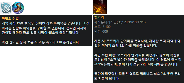 상세 TIP 점멸 + 텔포콜키 자체 스킬 기반의 딜이 상당히 강력합니다. 게다가 기본적인 스타일이 ‘원딜’과 비슷하기 때문에 평판 지속 딜로 강력합니다. 그래서 점화는 하지 않습니다. 보통 텔포를 듣고 미드라인의 로밍을 극대화하는 플레이를 요구합니다. 그래서 패시브인 마법공학 탄약에 긴 텀으로 등장하는 빠른 배송을 활용한 로밍을 한 후 텔포로 복귀하는 스타일입니다.