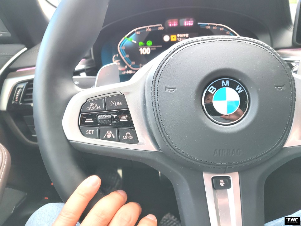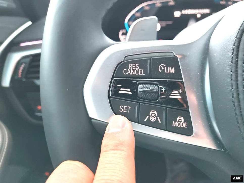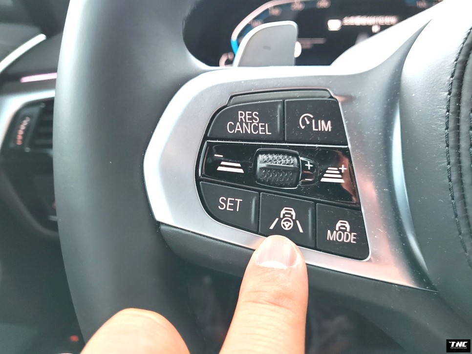 BMW의 반자율 주행을 위해서는 먼저 핸들 왼쪽 아래쪽 가운데 있는 시계 모양의 비슷한 버튼을 눌러야 하는데, 버튼을 누르면 현재 주행 속도가 최대 속도에 맞춰져 반자율 주행이 시작됩니다.