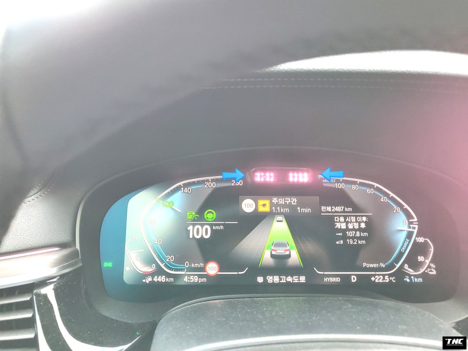 핸들을 놓고 5초 정도 지나면 노란색 경고등이 켜지는데 경고등이 켜질 때마다 핸들 터치를 해야 하는 번거로움을 만들기보다는 그냥 가볍게 손을 핸들에 얹고 주행하는 게 좋아요.사진에서 게시판에 화살표를 넣어둔 빨간등은 운전자 관찰 센서이며 졸음 감시 센서입니다.