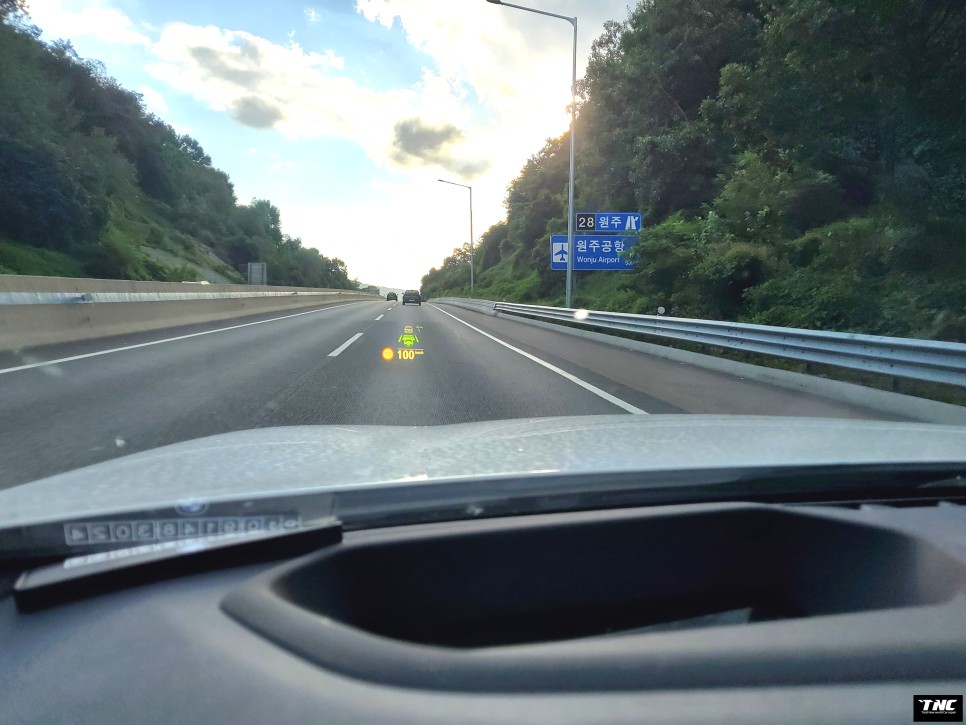 핸들 터치 센서에 노란색 불이 들어왔을 때 핸들을 터치하면 경고등이 꺼지고 다시 반자율 주행 모드로 운행하는데 생각보다 스마트한 주행을 합니다.