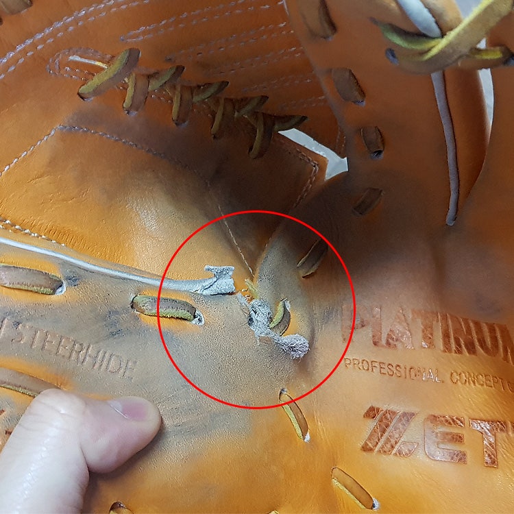 글러브 수리 작업 의뢰로 많이 들어오는 부위입니다.내피 상태만 좋다면 수선해서 사용하기 좋습니다.