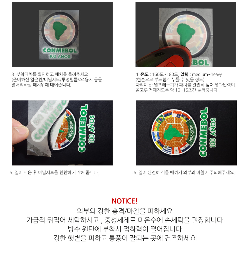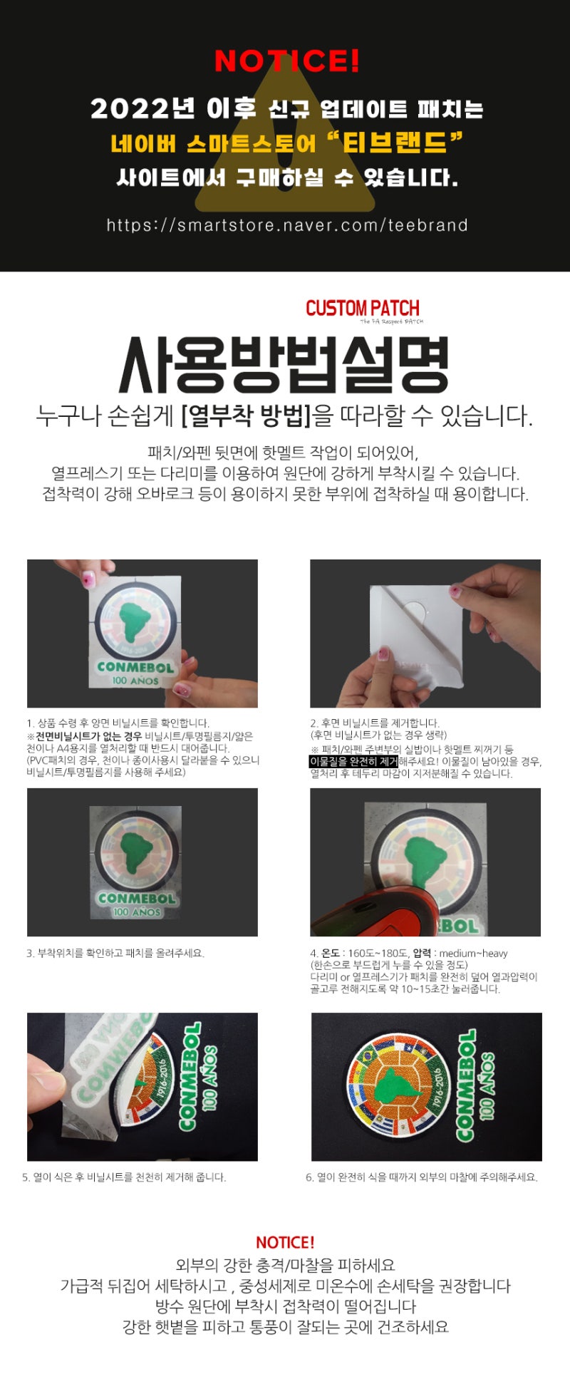 패치 와펜 셀프부착방법은 상품 상세페이지와 패치 구매시 동봉되는 부착설명서를 참고하시기 바랍니다.패치를 받고 꼭 확인해야 할 사항이 있습니다.가끔 패치 와펜을 주문해 받았는데 붙어있는 패치 피스 배열이 흩어져 있는 경우가 있습니다.레터링으로 알파벳이나 엠블럼의 별이 하나 없거나 한 경우가 아니면 불량이 아니므로 흐트러진 조각을 잘 맞춰주시면 됩니다.예를 들어 아래 유벤투스 엠블럼 패치 와펜은 책 모양과 별이 전면 보호 필름에 부착되어 따로 부착되어 있습니다. 어떤 이유로 별과 책 모양의 배열이 왕왕 어긋나는 경우가 발생합니다. 손가락이라도 괜찮지만 핀셋이 있으면 핀셋으로 위치를 조정해 주세요.인내심을 가지고 각자의 위치에 맞춰주시면 부착 설명서에 따라 패치를 붙입니다.유벤투스 엠블럼과 별 3개는 전면 보호 필름에 붙어 있습니다. 별의 위치를 조정하고 조정합니다.마지막으로 패치 마크의 부착이 끝나시면…셀프 마킹을 문제없이 잘했다고 끝이 없습니다. 셀프 표시된 축구 유니폼을 어떻게 유지 관리하느냐가 매우 중요합니다. 공식 상품을 포함하여 폐사에서 판매 중인 패치 헝겊만 아니라 열 처리 후 가공을 필요로 하는 대부분의 열 부착형 패치는 부착한 옷감과 보관 상태, 세탁 방법, 외부 충격 등에 매우 민감합니다.PVC플라스틱, 자수, 프록, 렉스토라, 필름, 실리콘 등 후 가공이 필요한 대부분의 열 부착형 패치는 부착시키려는 유니폼, 가방 등 부착물 소재에 따라서접착력이 다릅니다. 부착 원리는 패치 배면부에 핫 멜트 본드 성분이 칠해진 얇은 층이 있습니다. 이 본드 성분에 열 프레스기와 다리미로 열을 가하면 녹으면서 부착물과 패치에 접착됩니다. 유니폼 소재로 예를 들어 면 폴리에스테르에는 본드 성분이 스며들어 비교적 부착력이 강합니다. 우 분 바람 막이 옷 고어텍스류의 소재에는 본드 성분이 스며들기 어렵게 접착력이 떨어집니다. 특히 방수 코팅 특수 처리된 옷감에 접착력이 더 저하합니다. 가죽 금속 에나멜 소재도 접착력이 떨어지고 열에 약한 소재여서 열을 가하면 상처 받기 쉽습니다.부착 후 세탁을 할 경우 고온 빨래와 건조기, 탈수기, 유연제의 사용 등은 삼가 주십시오.-고온 빨래 건조기 사용시에 본드 성분이 녹거나 증발하기 위한 패치가 떨어지기 쉽습니다. -유연제와 일반 세제의 사용은 접착력을 약화시킵니다. 세탁 시 울 샴푸 등의 중성 세제 사용을 권장합니다. 보통 시판되는 세제의 뒷면”체액”부분에 중성의 여부가 표시되어 있습니다.-탈수로 치대등은 패치에 강한 마찰을 주고 패치를 훼손합니다.-보관시는 고온 다습한 환경, 햇빛에의 장기간 노출을 피하세요.가급적 옷을 뒤집어 중성 세제를 사용하는 찬물로 세수하는 것을 추천합니다. 강한 햇살을 피하고 통풍의 좋은 그늘에서 자연 건조하세요.패치가 곧 손상되거나 떨어지지 않도록 잘 관리하세요!제품에 대한 문의는 카카오톡 오픈채팅, 네이버톡을 이용하시고 상품은 네이버 스마트스토어를 통해 구매 가능합니다.상담시간 : 평일 10:00~17:00 토, 일/공휴일 휴무일 상담문의 : 아래 ‘카카오톡 오픈채팅’, ‘네이버톡’을 클릭해주세요.티브랜드 #록스전사유니폼 #명품축구유니폼 #단체복 #단체티 #과티셔츠 #반티셔츠 #인쇄마킹 #유니폼마킹 #스포츠용품 #패치제작 #로고디자인제작 open.kakao.com티브랜드 #록스전사유니폼 #명품축구유니폼 #단체복 #단체티 #과티셔츠 #반티셔츠 #인쇄마킹 #유니폼마킹 #스포츠용품 #패치제작 #로고디자인제작 open.kakao.com궁금하실 때 네이버 톡톡하세요!티브랜드 대구광역시 북구 침산남로9길 5 상가 B1 티브랜드티브랜드 대구광역시 북구 침산남로9길 5 상가 B1 티브랜드티브랜드 대구광역시 북구 침산남로9길 5 상가 B1 티브랜드