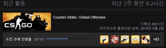 블로그 주인 카스시간 부갸가 하나 더 있는데 스팀 인증번호를 받기가 귀찮아 사진에 올리지 않았다.이 게임에 빠졌던 과거, 나는 지난 2주간 거의 80~100시간 가까이 플레이했다.